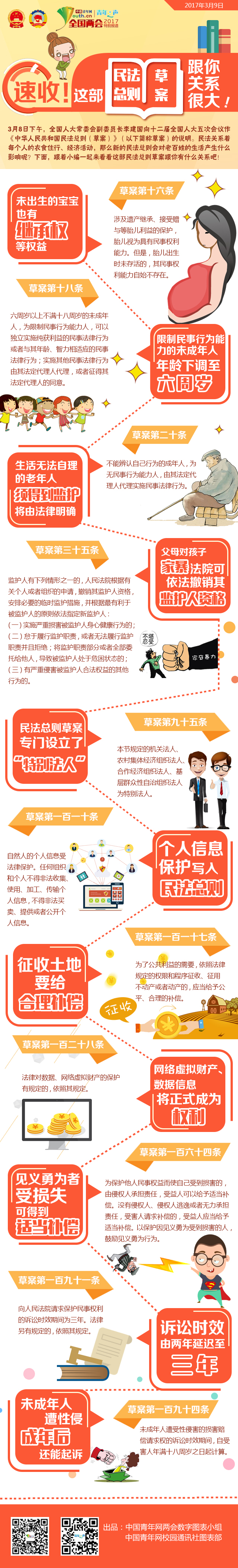 中國(guó)青年網(wǎng)北京3月9日電3月8日下午,全國(guó)人大常委會(huì)副委員長(zhǎng)李建國(guó)向十二屆全國(guó)人大五次會(huì)議作《中華人民共和國(guó)民法總則(草案)》(以下簡(jiǎn)稱草案)的說明。民法關(guān)系著每個(gè)人的衣食住行、經(jīng)濟(jì)活動(dòng),那么新的民法總則會(huì)對(duì)老百姓的生活產(chǎn)生什么影響呢?下面,跟著小編一起來看看這部民法總則草案跟你有什么關(guān)系吧!
