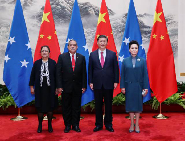3月27日,國(guó)家主席習(xí)近平在北京人民大會(huì)堂同密克羅尼西亞聯(lián)邦總統(tǒng)克里斯琴舉行會(huì)談。會(huì)談前,習(xí)近平在人民大會(huì)堂東門外廣場(chǎng)為克里斯琴舉行歡迎儀式。這是習(xí)近平和夫人彭麗媛同克里斯琴總統(tǒng)夫婦合影。新華社記者鞠鵬攝