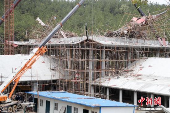 資料圖:3月28日,湖北麻城市五腦山水上游樂項(xiàng)目綜合樓穹頂模板支撐腳手架垮塌事故現(xiàn)場(chǎng)。中新社記者 張暢 攝