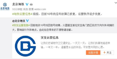 北京地鐵公司官方微博隨后通報,目前10號線信號故障已修復,運營秩序逐步恢復。