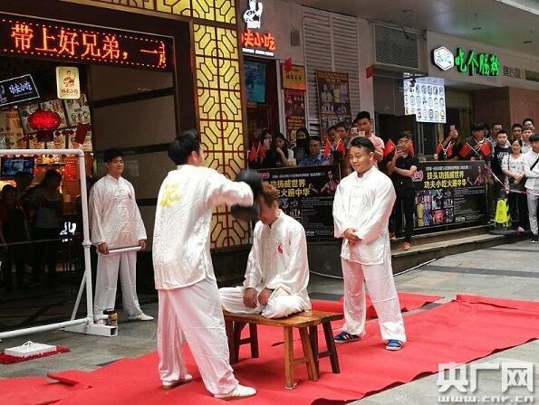 央廣網(wǎng)深圳4月29日消息(記者 于揚(yáng))在深圳真有鐵頭功!而且這位高手就藏在深圳的東門,他可以倒立在一根堅(jiān)硬的鐵釘上數(shù)十分鐘,他就是鄭衛(wèi)勇。在之前香港舉行的“感恩杯”第十屆香港國(guó)際武術(shù)大賽上,他表演頭頂鐵釘?shù)沽,預(yù)計(jì)表演80分鐘,但第40分鐘時(shí),裁判員已經(jīng)激動(dòng)地宣布他獲得了冠軍!記者近日也用鏡頭紀(jì)錄了他令人咋舌的“功力”——倒立在一根堅(jiān)硬的鐵釘上,頭部把釘在木板上的鐵釘壓彎!