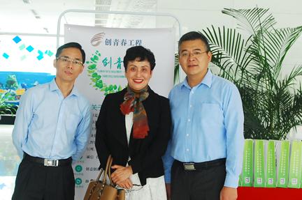 薛莉老師(中)與創(chuàng)青春工程創(chuàng)始團(tuán)隊(duì)合影左為馬安華董事長(zhǎng)