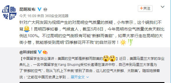 人民網(wǎng)北京5月22日電 今日,一段關(guān)于“中國留學(xué)生說美國空氣又甜又鮮”的視頻在網(wǎng)上引發(fā)熱議,這位來自昆明的中國留學(xué)生稱,她當(dāng)時在國內(nèi)每當(dāng)出門都不得不戴口罩。對此,昆明黨務(wù)政務(wù)信息公開平臺官方微博發(fā)聲:這個鍋我們不背。