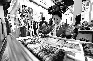 東北渤海靺鞨繡參加北京國際服務貿易交易會展出。 北京晨報記者 李木易/攝