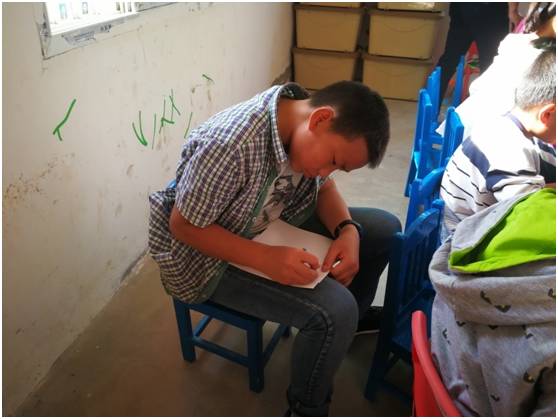 課堂上,大大小小團(tuán)聚著有20多個(gè)孩子,其中有一個(gè)約十幾歲的男孩,臉略有些黑紅,一直沉默著,也許是在其他孩子的嘰嘰喳喳中,他的悶聲不響引起了我的注意。只見他第一個(gè)把給媽媽的賀卡寫好,細(xì)心的用彩帶打好蝴蝶結(jié),交給老師。