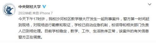 據(jù)中央財(cái)經(jīng)大學(xué)官方微博消息,今天下午17時許,中央財(cái)經(jīng)大學(xué)沙河校區(qū)教學(xué)樓大廳發(fā)生一起刑事案件,警方第一時間趕到現(xiàn)場,對現(xiàn)場進(jìn)行勘察和取證,學(xué)校已啟動應(yīng)急機(jī)制,校領(lǐng)導(dǎo)和相關(guān)部門負(fù)責(zé)人已到場處理。目前學(xué)校穩(wěn)定,教學(xué)、工作、生活秩序正常,該案件的有關(guān)信息警方正在調(diào)查。