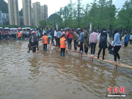 6月15日,受強(qiáng)降雨影響,貴州省六盤水市鐘山區(qū)六盤水師范學(xué)院部分低洼處路面積水。中新社記者 鐘欣 攝