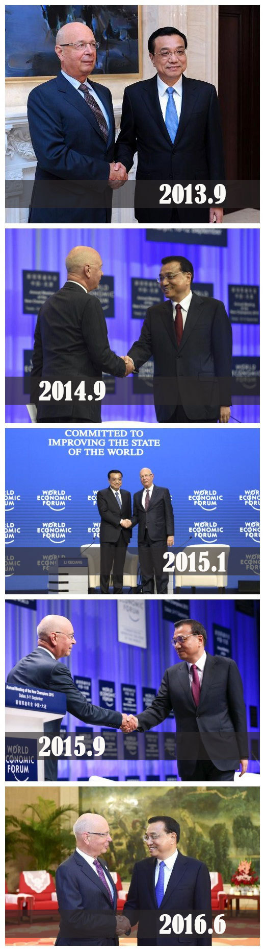 世界經(jīng)濟論壇主席施瓦布是李克強總理的“老友團”成員之一,因為達沃斯論壇,二人每年都會舉行會面。你還記得下面這些握手那一瞬間的精彩嗎?
