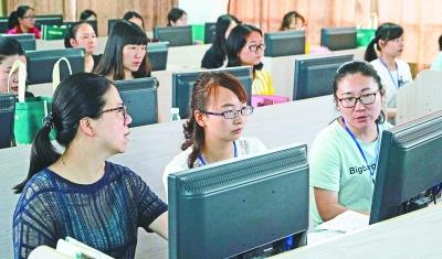 上午9時30分許,經(jīng)過層層“關(guān)卡”后,記者來到4樓一個閱卷現(xiàn)場。房間里非常安靜,老師們整齊地坐在電腦前,要批閱的題目清楚地顯示在電腦上。武漢市招考辦稱,所有的試卷掃描、客觀題評分等專用設(shè)備,與高考閱卷是同一套儀器。據(jù)介紹,所有學(xué)科預(yù)計6月28日左右完成閱卷。
