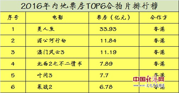 縱觀當(dāng)下影視合拍市場,內(nèi)地與香港的合拍片一直是合拍片中的主流。這既是內(nèi)地給了香港機(jī)會(huì),也是香港憑借自身多年的影業(yè)積累為內(nèi)地帶來的新的發(fā)展機(jī)遇,促進(jìn)內(nèi)地商業(yè)電影的崛起,帶動(dòng)了內(nèi)地電影市場與產(chǎn)業(yè)規(guī)模的發(fā)展。值得回味的是,CEPA簽署的那一年,內(nèi)地電影總票房只有10.1億元,2016年中國全年電影票房457.12億,單單內(nèi)地香港合拍片票房前6的電影作品票房總額就達(dá)79.33億元。