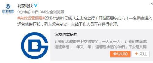 據(jù)北京地鐵公司官方微博消息,6月27日20:04地鐵1號(hào)線八寶山站上行(開(kāi)往四惠東方向)一名乘客進(jìn)入運(yùn)營(yíng)軌道正線,列車緊急制動(dòng),車站工作人員進(jìn)行處理。北京地鐵公司官方微博隨后又發(fā)布續(xù)報(bào),稱該乘客被抬上,20:36運(yùn)營(yíng)秩序逐步恢復(fù)。