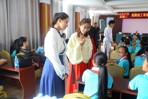 央廣網(wǎng)北京7月3日消息(張瑜瑜)日前,南陽理工學(xué)院文法學(xué)院選派20名師生,組成文化服務(wù)隊(duì)前往南陽市宛城區(qū)蒲山鎮(zhèn),開展以“弘揚(yáng)傳統(tǒng)文化,共享共傳共建”為主題的公益服務(wù)活動(dòng),包括經(jīng)典誦讀吟唱、漢服文化講解、傳統(tǒng)禮儀講授、文化典故表演等。