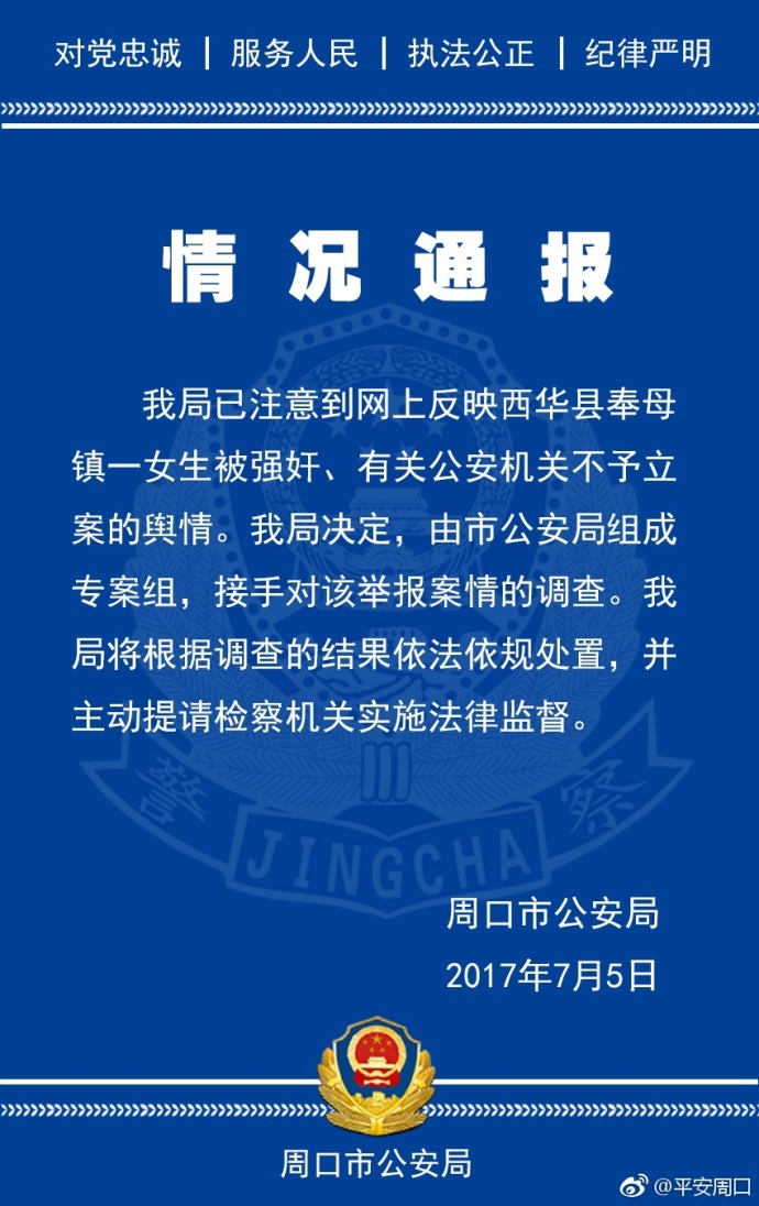 據(jù)河南省周口市公安局官方微博“平安周口”發(fā)布的消息,該局已注意到網(wǎng)上反映西華縣奉母鎮(zhèn)一女生被強奸、有關公安機關不予立案的輿情。該局決定,由市公安局組成專案組,接手對該舉報案情的調查。