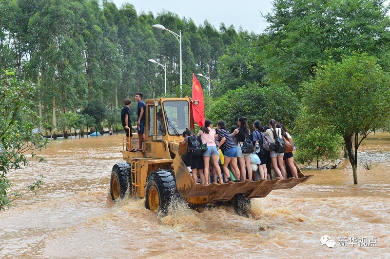 7月2日晚上,桂林旅游學(xué)院學(xué)生宿舍區(qū)被洪水圍困,5000名學(xué)生被困一夜。在學(xué)校附近修路的中建八局施工隊得知消息后,駕駛鏟車來到學(xué)校。一輛輛鏟車為學(xué)生架起了“生命之舟”,助學(xué)生脫離險境。