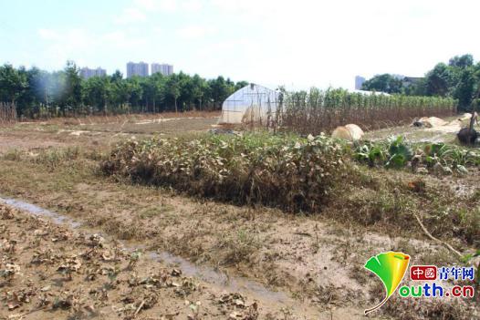 高塘村米家被洪水淹過(guò)的菜地,蔬菜苗全被淤泥糊住。中國(guó)青年網(wǎng)記者 劉利影攝