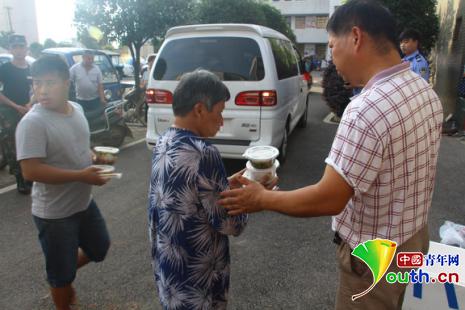 黃興中學(xué)安置點(diǎn),晚來(lái)的村民領(lǐng)取晚飯。中國(guó)青年網(wǎng)記者 劉利影攝