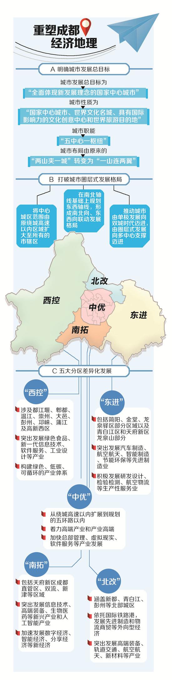 其中,“東進(jìn)、南拓、西控、北改、中優(yōu)”十字方針是成都調(diào)整城鎮(zhèn)空間布局,重塑經(jīng)濟(jì)地理的基本方法。