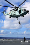 海軍第十二批護航任務(wù)接護人質(zhì)瞬間。圖為第一架次接回的船員跳下飛機。