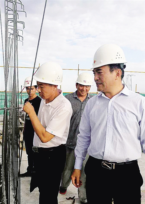 劉志懷(右一)查看哈密豫新能源產(chǎn)業(yè)研究院建設(shè)工地。 (資料圖片)