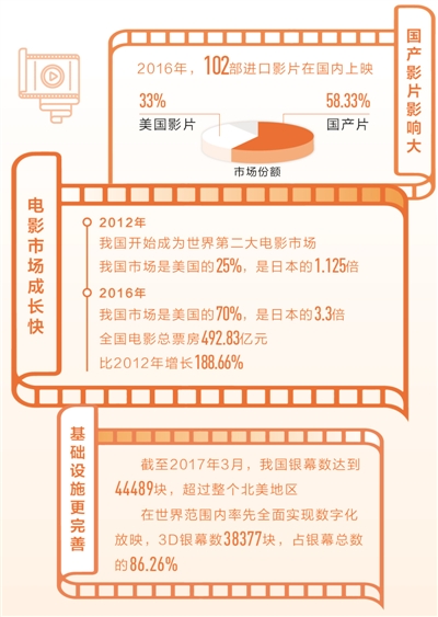 自2012年開始,我國超過日本,成為世界第二大電影市場,與美國市場的差距也在逐步縮小。據(jù)統(tǒng)計,2012年我國市場為美國的25%,是第三大市場的1.125倍,2016年則達到美國的70%,是日本的3.3倍。