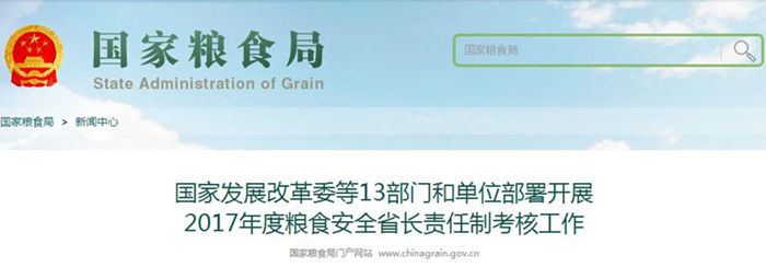 央視網(wǎng)消息:據(jù)國家糧食局網(wǎng)站消息,國家發(fā)展改革委等13部門和單位部署開展 2017年度糧食安全省長責(zé)任制考核工作。