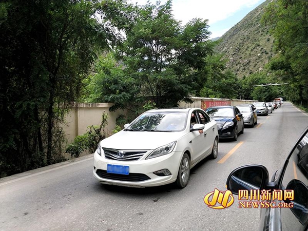 下午3點半左右,四川新聞網(wǎng)記者或準進入漳扎鎮(zhèn)。記者一路上看到,在警方的指揮下,景區(qū)滯留車輛排隊緩慢向縣城方向行駛,這些車輛來自全國各地,排隊長龍約有5公里左右,盡管車輛較多,但通行秩序良好。