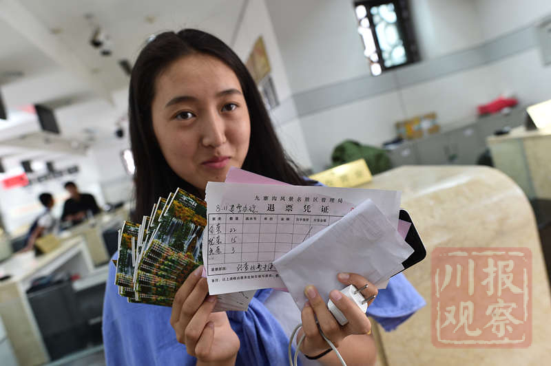 8月10日21時20分,成都夜色正濃,成都百花商務(wù)樓三樓卻是一片燈火通明。不到20分鐘,來自德陽的2名游客就辦理了九寨溝景區(qū)退票業(yè)務(wù)。