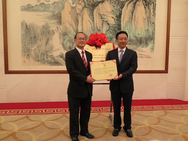 全國(guó)政協(xié)教科文衛(wèi)體委員會(huì)副主任、香港中華總商會(huì)會(huì)長(zhǎng)、香港新華集團(tuán)董事會(huì)主席蔡冠深13日受聘出任云南—東盟商企合作委員會(huì)主席聘書。云南省高峰副省長(zhǎng)與蔡冠深博士共同為云南—東盟商企合作委員會(huì)成立揭牌。
