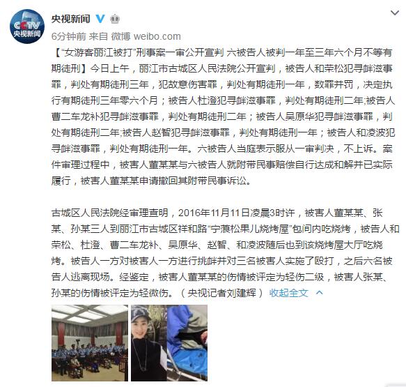 人民網北京8月17日電 據中央電視臺新聞中心官方微博消息,今日上午,麗江市古城區(qū)人民法院公開宣判,被告人和榮松犯尋釁滋事罪,判處有期徒刑三年,犯故意傷害罪,判處有期徒刑一年,數罪并罰,決定執(zhí)行有期徒刑三年零六個月;被告人杜澄犯尋釁滋事罪,判處有期徒刑二年;被告人曹二車龍補犯尋釁滋事罪,判處有期徒刑二年;被告人吳原華犯尋釁滋事罪,判處有期徒刑二年;被告人趙智犯尋釁滋事罪,判處有期徒刑一年;被告人和凌波犯尋釁滋事罪,判處有期徒刑一年。六被告人當庭表示服從一審判決,不上訴。案件審理過程中,被害人董某某與六被告人就附帶民事賠償自行達成和解并已實際履行,被害人董某某申請撤回其附帶民事訴訟。