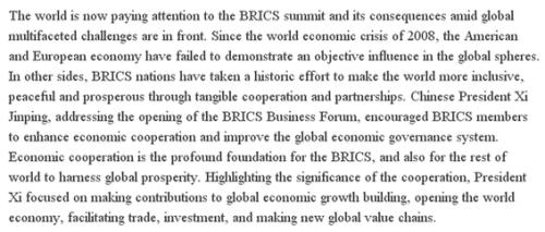 二戰(zhàn)后建立的國際機(jī)構(gòu),無法解決世界面臨的主要挑戰(zhàn)。相反,這些機(jī)構(gòu)進(jìn)一步助長西方霸權(quán)主義,阻止發(fā)展中國家做出重大貢獻(xiàn)。而金磚合作機(jī)制2006年正式建立之后,嘗試在包容性增長、平等、和平、和諧及雙贏的基礎(chǔ)之上提供一種替代性的全球新秩序。習(xí)近平主席表示,弱肉強(qiáng)食的叢林法則、你輸我贏的零和游戲不再符合時(shí)代邏輯,和平、發(fā)展、合作、共贏成為各國人民共同呼聲。如今,金磚國家峰會已成為一個(gè)全面的綜合性論壇,世界領(lǐng)導(dǎo)人在此濟(jì)濟(jì)一堂,深入探討共同關(guān)切的問題,建立共識、提出政策性建議。