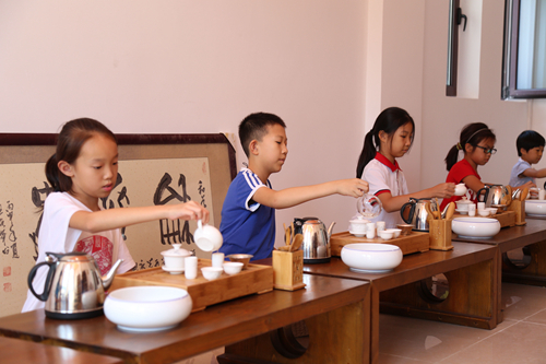 “茶道館”中,身著漢服的同學(xué)們正在有模有樣地表演茶道。只見一位女生先用熱水燙杯,再取茶入杯。接著,她將蓋子反過來貼在茶杯的一邊,將水注入蓋子,使其沿杯邊而下。然后輕搖茶杯,使茶葉被水充分浸潤(rùn),濃濃的茶香開始彌散開來。大家很快就被茶道的文雅所感染,就連平日里最淘氣的男生也自然而然變得端莊起來……