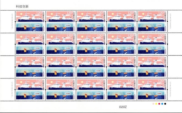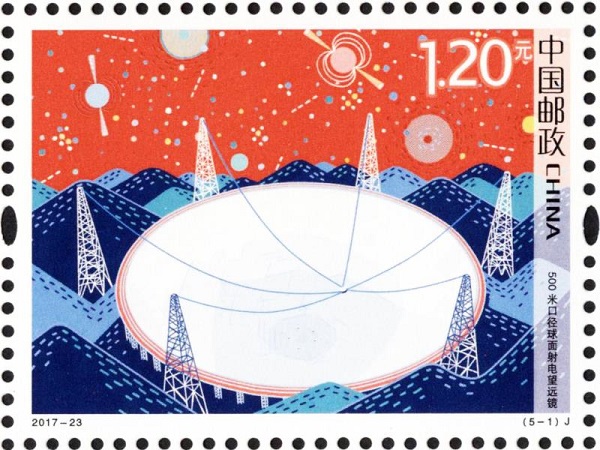 2017年9月17日發(fā)行的《科技創(chuàng)新》紀(jì)念郵票一套5枚,圖案內(nèi)容分別為:500米口徑球面射電望遠(yuǎn)鏡、“墨子號(hào)”量子科學(xué)實(shí)驗(yàn)衛(wèi)星、“探索一號(hào)”科考船、渤海糧倉(cāng)科技示范工程、“神威·太湖之光”超級(jí)計(jì)算機(jī)。全套郵票面值為6.60元!犊萍紕(chuàng)新》紀(jì)念郵票展現(xiàn)了我國(guó)在科技領(lǐng)域取得的一批國(guó)際領(lǐng)先的重大成果:第一枚500米口徑球面射電望遠(yuǎn)鏡,畫(huà)面以望遠(yuǎn)鏡的主體結(jié)構(gòu)為表現(xiàn)元素,描繪了主動(dòng)反射面技術(shù)、輕型索拖動(dòng)饋源支撐技術(shù)和利用天然地貌建設(shè)巨型望遠(yuǎn)鏡的三大自主技術(shù)創(chuàng)新點(diǎn)。郵票背景通過(guò)表現(xiàn)中性氫、脈沖星、空間天體等科學(xué)符號(hào),展現(xiàn)了望遠(yuǎn)鏡作為多學(xué)科基礎(chǔ)研究平臺(tái)的強(qiáng)大功能。在紫外光下觀察,模擬了射電望遠(yuǎn)鏡從天空接收信號(hào),再?gòu)纳潆娡h(yuǎn)鏡鏡面反射到饋源的科學(xué)原理。第二枚“墨子號(hào)”量子科學(xué)實(shí)驗(yàn)衛(wèi)星的主要科學(xué)目標(biāo)是借助衛(wèi)星平臺(tái),進(jìn)行星地高速量子密鑰分發(fā)實(shí)驗(yàn),并在此基礎(chǔ)上進(jìn)行廣域量子密鑰網(wǎng)絡(luò)實(shí)驗(yàn);二是在空間尺度進(jìn)行量子糾纏分發(fā)和量子隱形傳態(tài)實(shí)驗(yàn),開(kāi)展空間尺度量子力學(xué)完備性檢驗(yàn)的實(shí)驗(yàn)研究。畫(huà)面以宇宙空間中的衛(wèi)星和地球?yàn)橹饕憩F(xiàn)對(duì)象,地球上的五個(gè)點(diǎn)分別表示南山、德令哈、興隆、麗江四個(gè)量子通信地面站和位于阿里的量子隱形傳態(tài)實(shí)驗(yàn)站。紫外光下,兩束光直射北京興隆站和新江南山站,表現(xiàn)了“墨子號(hào)”最主要的科學(xué)實(shí)驗(yàn)。第三枚“探索一號(hào)”科考船,畫(huà)面以4500米載人潛水器工作母船及深?瓶纪ㄓ闷脚_(tái)——“探索一號(hào)”為畫(huà)面主體,除此以外畫(huà)面中還表現(xiàn)了其搭載的“海斗”號(hào)無(wú)人潛水器、“天涯”號(hào)著陸器、“海翼”號(hào)水下滑翔機(jī)的形象。紫外光下,表現(xiàn)了“海斗”號(hào)無(wú)人潛水器、“天涯”號(hào)著陸器和“海翼”號(hào)水下滑翔機(jī)在海底最大的下潛深度。第四枚渤海糧倉(cāng)科技示范工程,畫(huà)面表現(xiàn)了豐收的場(chǎng)景,體現(xiàn)了中低產(chǎn)田和鹽堿荒地的改造對(duì)農(nóng)業(yè)增產(chǎn)、增收的顯著效果,此外畫(huà)面中的無(wú)人機(jī)、田間檢測(cè)儀等新技術(shù)也體現(xiàn)了基于現(xiàn)代農(nóng)業(yè)技術(shù)背景下的傳統(tǒng)農(nóng)業(yè)技術(shù)變革。紫外光下,越往下越高的鹽份表現(xiàn)了鹽堿地改造過(guò)程中鹽份的下移。第五枚“神威·太湖之光”超級(jí)計(jì)算機(jī),郵票畫(huà)面以位于江蘇省國(guó)家超級(jí)計(jì)算無(wú)錫中心的超級(jí)計(jì)算機(jī)機(jī)柜為主體元素,畫(huà)面背景表現(xiàn)了超級(jí)計(jì)算機(jī)在航空航天、天氣氣候、生物信息、材料科學(xué)、計(jì)算化學(xué)等國(guó)家高科技領(lǐng)域和尖端技術(shù)研究中的廣泛應(yīng)用。紫外光下,計(jì)算機(jī)發(fā)射的代表二進(jìn)制的“0”和“1”視覺(jué)化了不能被看見(jiàn)的超級(jí)運(yùn)算能力。