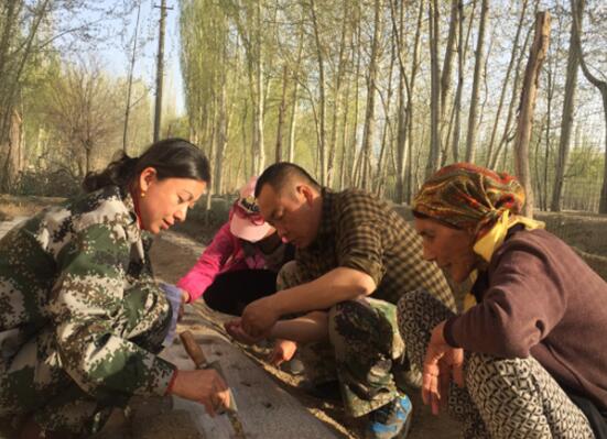 4月,嫩綠的楊樹葉已站滿了枝頭,正是種菜的好時節(jié)。工作隊來到阿提坎木·依司馬義力老大媽家,遠(yuǎn)遠(yuǎn)地就看見她彎著腰在菜地里干活兒。大家連忙拿起小鐵鏟和菜種子,幫她種菜。不一會,白色地膜上就留下了一排排整齊的小土堆?吹近h華身上有土,大媽連忙拿了個小掃帚幫她掃,那種和藹溫柔的眼神,儼然像一個母親對待一個調(diào)皮的孩子。臨走的時候,老大媽拉著黨華的手說:“你就像我的丫頭一樣。”黨華連忙對大媽說:“以后我就是您的孩子,會經(jīng)常來看您的!睆哪且院,黨華也真正把老大媽當(dāng)成了親人。黨華每次在村委會遇到老大媽,都會熱情地把老大媽接到宿舍來坐一會。