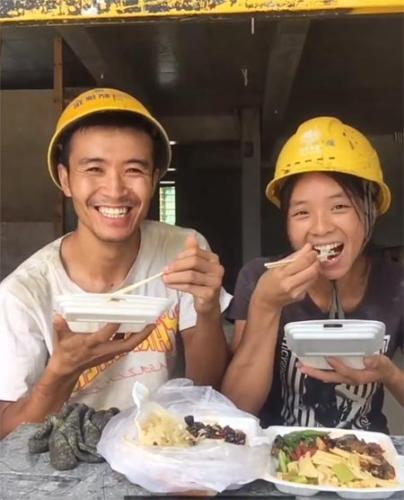 劉磊(左一)、李霞夫婦在工地吃午飯時錄制視頻, 該視頻在平臺點擊量達88萬,有近4000條評論。