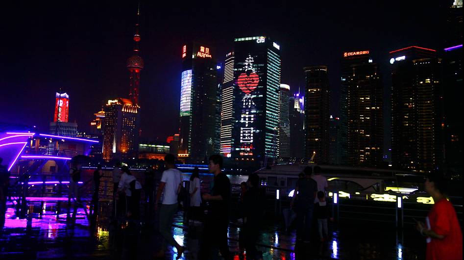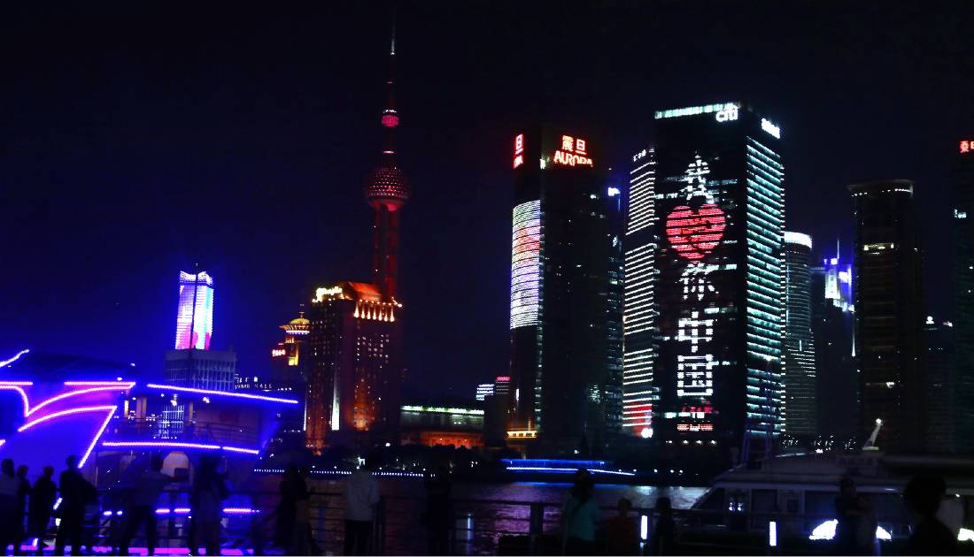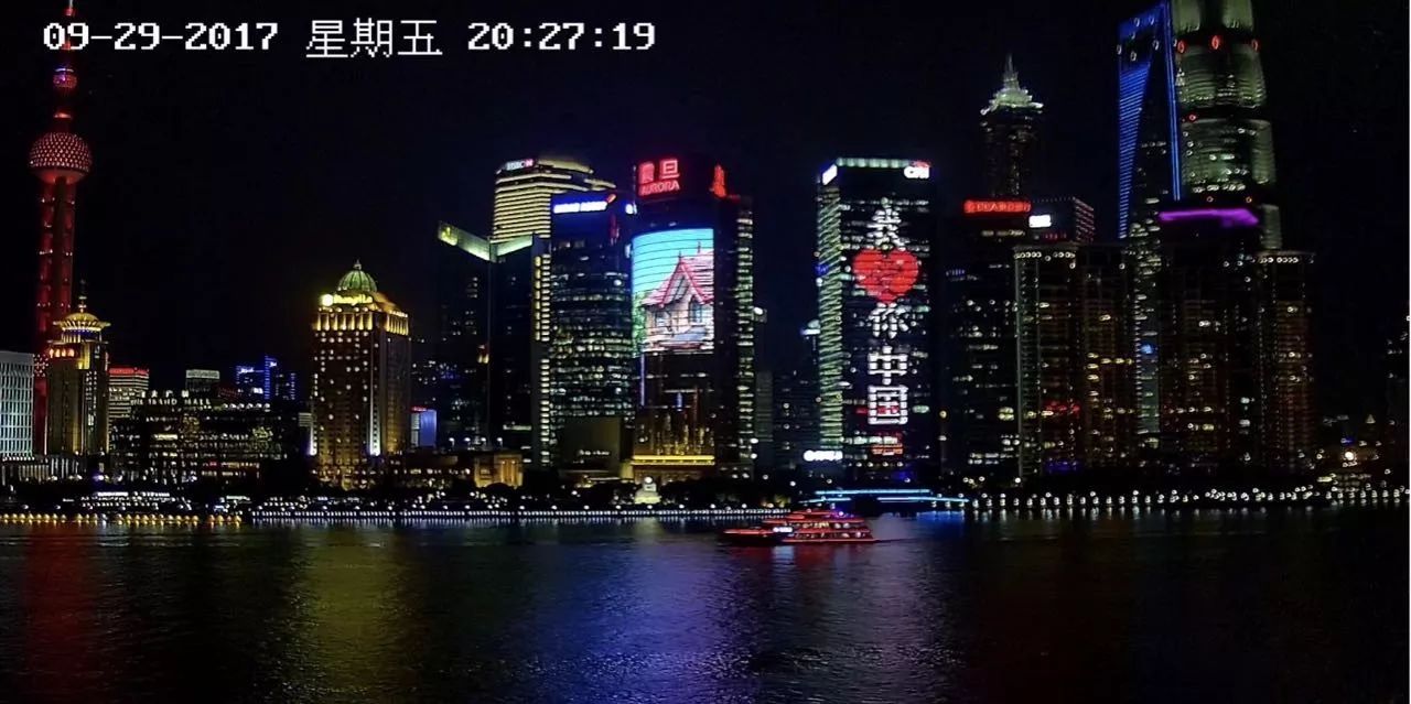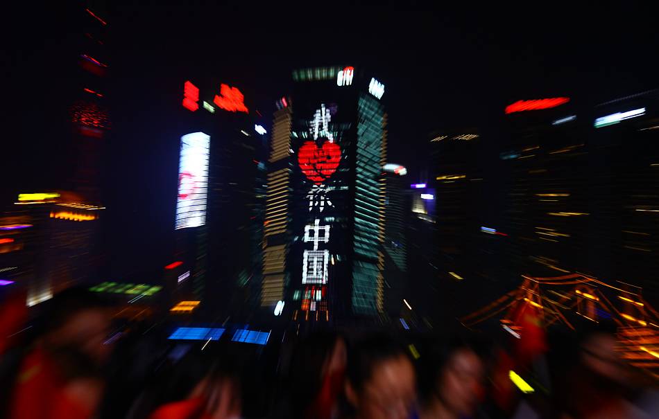 夜晚的浦江兩岸,流光溢彩,熱鬧非凡。在東方明珠、在浦江邊的摩登建筑上,“我愛你中國”格外亮麗奪目。