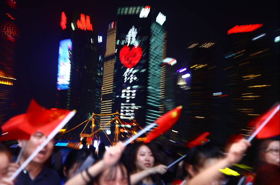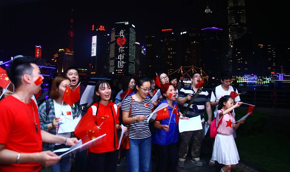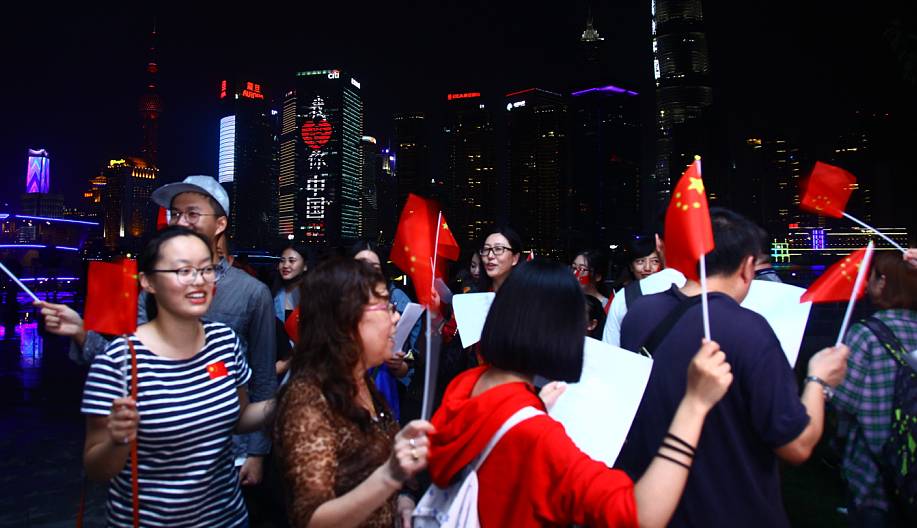 眾多熱心網(wǎng)友來到外灘,他們揮舞著五星紅旗,在黃浦江邊共同唱響這首心中的歌:《我愛你,中國!》