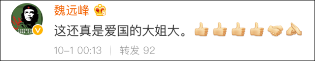 這條表達愛國之心的微博獲得了網(wǎng)友們的一致贊賞,大家紛紛送上好評: