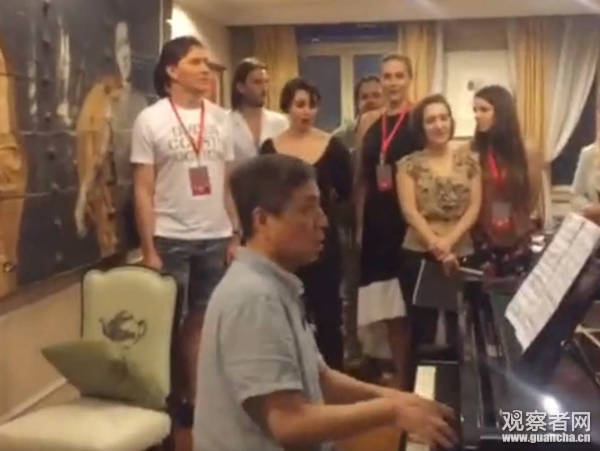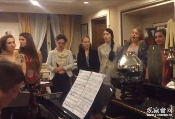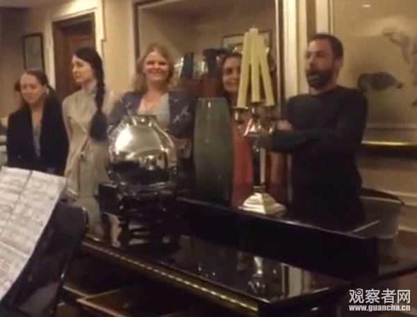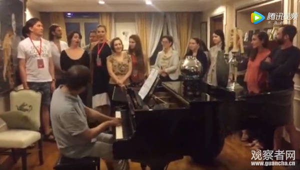 視頻中,鋼琴旁清一色的高鼻梁深邃眼睛。不大的房間里,14名老外站在鋼琴前,隨著鋼琴的演奏分聲部歌唱。