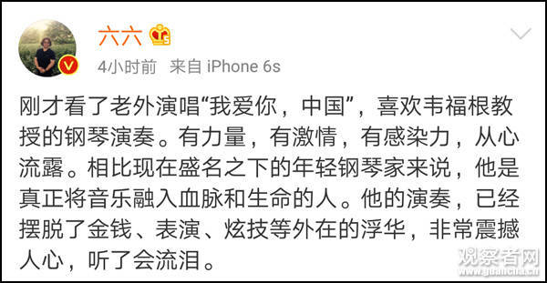 聽著這歌聲,直教人熱血沸騰,知名作家六六在微博盛贊:看著看著就流淚了。