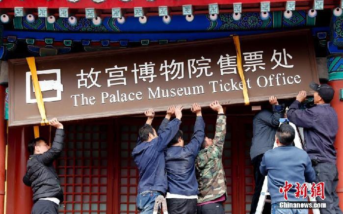 10月10日,北京故宮博物院售票處的牌子被工作人員摘下。中新社記者 杜洋 攝