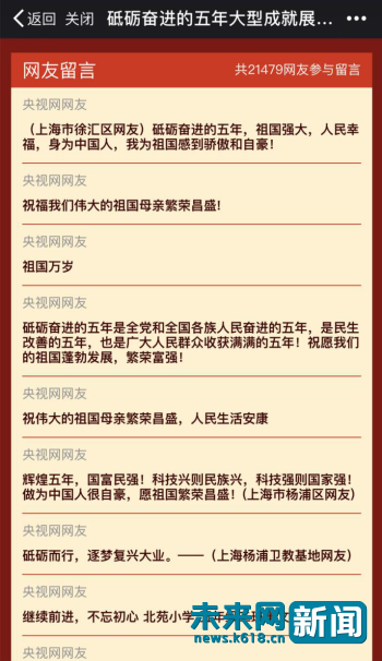 未來網(wǎng)(www.k618.cn)北京10月12日電(記者謝青)“電視上演北京在舉辦國家五年來的成就展,看著可真好啊!薄盃敔斠郧笆擒娙,真想讓他看一看展出的軍備模型。”“朋友圈里國內(nèi)的同學都在曬照,瘋狂為祖國打call!”自9月底,“砥礪奮進的五年”大型成就展在北京展覽館開放以來,吸引了大批的參觀者,但遠在其他地區(qū)甚至是海外的國民也紛紛通過各種方式,表達了希望觀展的愿望。