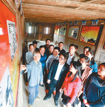 黨員干部引導(dǎo)老人關(guān)注十九大報(bào)告中的養(yǎng)老政策。