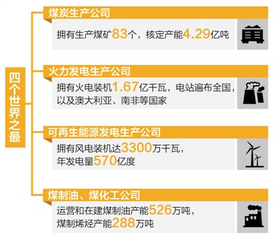 資產(chǎn)規(guī)模超過(guò)1.8萬(wàn)億元,擁有33萬(wàn)名員工、8家科研院所、6家科技企業(yè),形成煤炭、常規(guī)能源發(fā)電、新能源、交通運(yùn)輸、煤化工、產(chǎn)業(yè)科技、節(jié)能環(huán)保、產(chǎn)業(yè)金融等8大業(yè)務(wù)板塊……重組后的國(guó)家能源集團(tuán)可謂能源“巨無(wú)霸”,按照2016年年底的口徑計(jì)算,它同時(shí)擁有了四個(gè)世界之最——