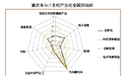 雖然增幅顯著,但與2015年相比,重慶市“6+1”支柱產業(yè)的科技競爭力全國排名總體態(tài)勢卻略有下降,汽車摩托車行業(yè)從第一下降為第二;裝備制造業(yè)下降6位,排名19;石油天然氣化工下降8位,排名24;材料產業(yè)下降7位,排名19;能源產業(yè)下降5位,排名25;輕紡及勞動密集型產業(yè)下降2位,排名20。