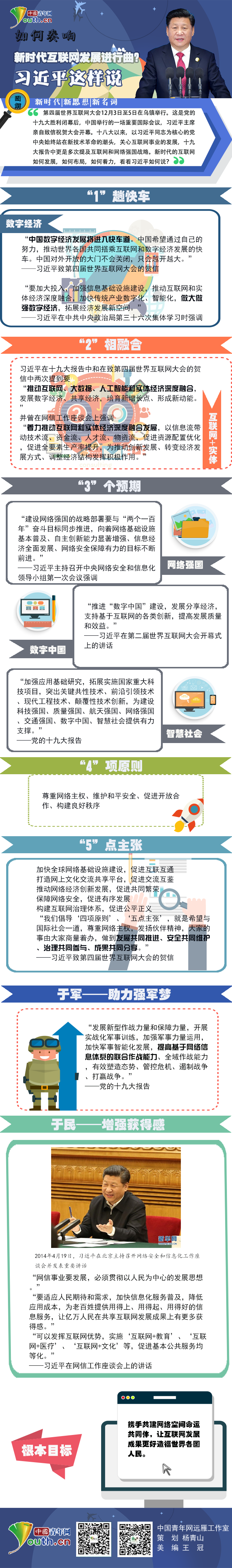 中國青年網(wǎng)北京12月6日電 第四屆世界互聯(lián)網(wǎng)大會12月3日至5日在烏鎮(zhèn)舉行。這是黨的十九大勝利閉幕后,中國舉行的一場重要國際會議,習(xí)近平主席親自致信祝賀大會開幕。十八大以來,以習(xí)近平同志為核心的黨中央始終站在新技術(shù)革命的潮頭,關(guān)心互聯(lián)網(wǎng)事業(yè)的發(fā)展,十九大報告中更是多次提及互聯(lián)網(wǎng)和網(wǎng)絡(luò)強國戰(zhàn)略。新時代的互聯(lián)網(wǎng)如何發(fā)展,如何布局,如何著力,看看習(xí)近平如何說?