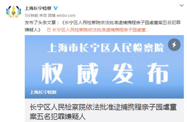 2017年12月13日,長寧區(qū)人民檢察院依法對攜程親子園工作人員鄭某、吳某、周某某、唐某、沈某某以涉嫌虐待被看護(hù)人罪批準(zhǔn)逮捕。