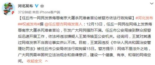 據(jù)河北省人民政府新聞辦公室官方微博消息,13日,河北任丘一網(wǎng)民在網(wǎng)絡(luò)上發(fā)表侮辱南京大屠殺死難者言論,任丘市公安局依法將違法嫌疑人王某傳喚至公安機(jī)關(guān),王某對(duì)其不當(dāng)言論事實(shí)供認(rèn)不諱,目前,王某被依法行政拘留15日。