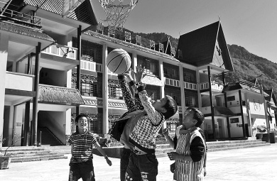 云南省怒江傈僳族自治州貢山獨(dú)龍族怒族自治縣獨(dú)龍江鄉(xiāng)中心小學(xué)的孩子在新校舍前打籃球。新華社記者 藺以光攝