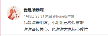昨天半夜,小姐姐的朋友通過(guò)她微博回應(yīng),她已經(jīng)沒(méi)事了,謝謝各位的關(guān)心,也謝謝大家的熱心幫忙。