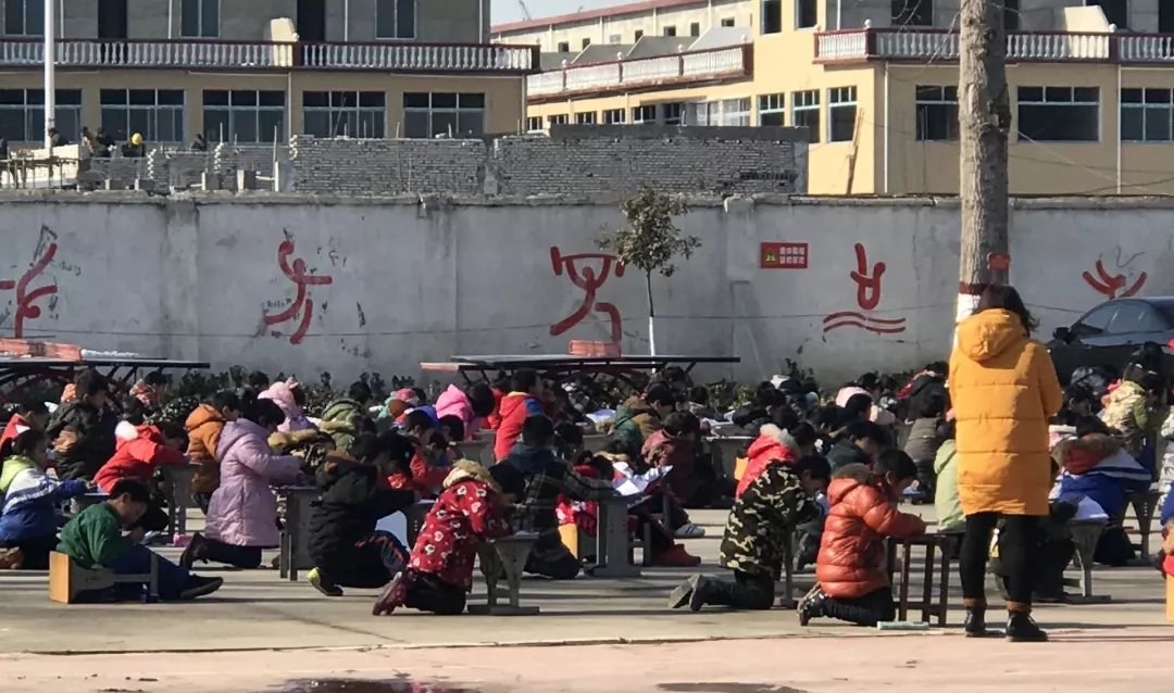 1月11日下午,記者在河南省南陽(yáng)市官莊鎮(zhèn)第一中心小學(xué)門口看到,學(xué)校的操場(chǎng)上跪著很多學(xué)生,在寒冷的天氣中進(jìn)行著考試。